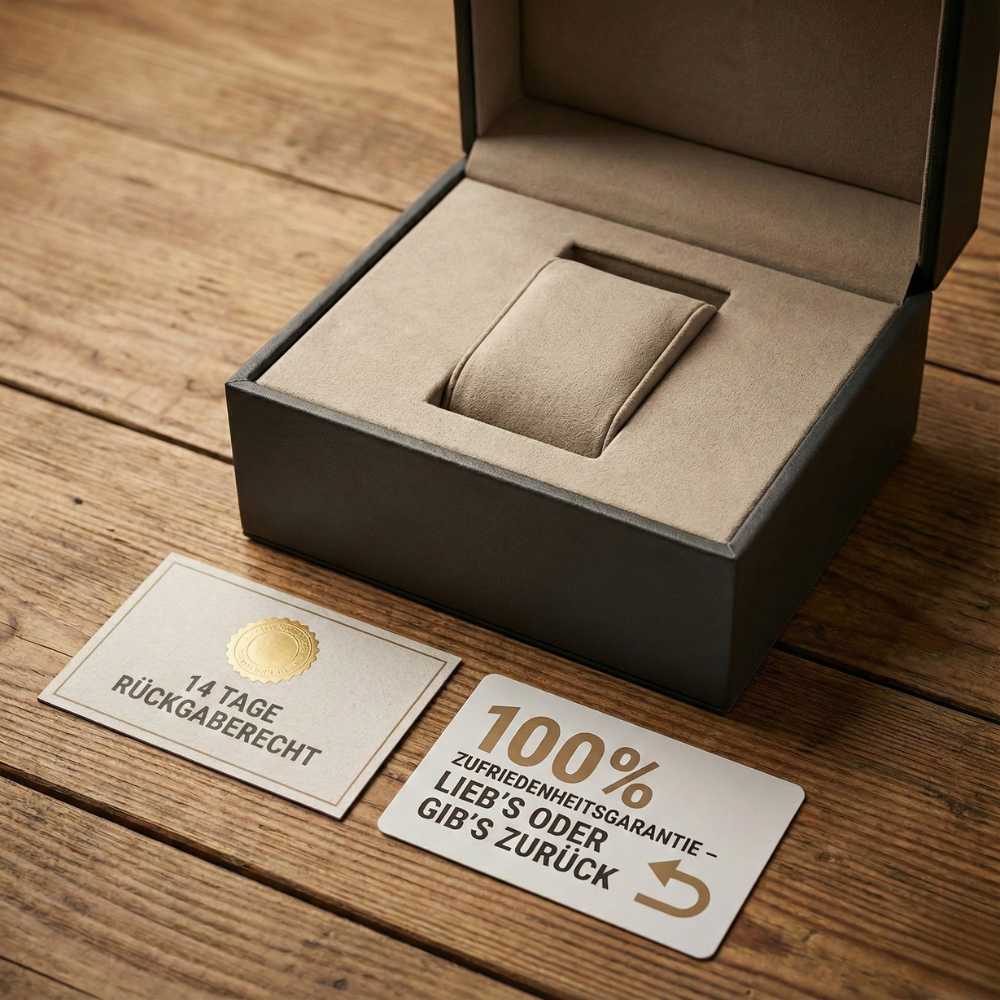 Wir möchten, dass du zu 100 % zufrieden bist. Wenn die Uhr nicht zu dir passt, kannst du sie innerhalb von 14 Tagen in der Originalverpackung an uns zurücksenden und erhältst dein Geld zurück.